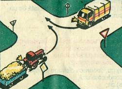 Pentru a vira la stânga în intersectia din imaginea alaturata, tractoristul trebuie sa acorde prioritate de trecere autocamionului? a) da, întrucât în aceasta situatie se aplica regula prioritatii de dreapta; b) nu, deoarece si autocamionul vireaza pe un drum fara prioritate; c) nu, deoarece tractorul vireaza de pe drumul cu prioritate. |
