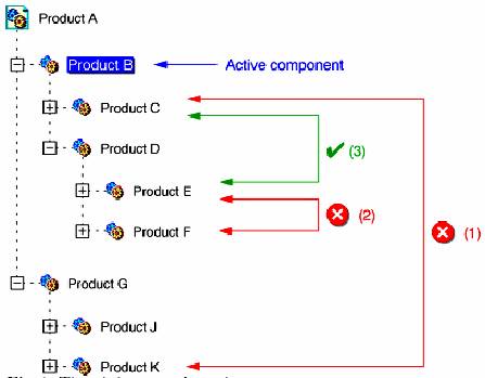 - Constrāngerea (3) poate fi aplicata deoarece Product C apartine componentului activ Product B. De asemenea, Product E este continut īn Product D care este la rāndul sau continut īn Product B care este activ.