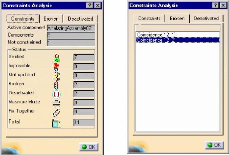 - Se selecteaza cea de-a doua fata de constrāns, īn partea stānga a figurii 2. Este afisat dialogul Constraint Properties īn care sunt indicate componentele si statutul acestora;