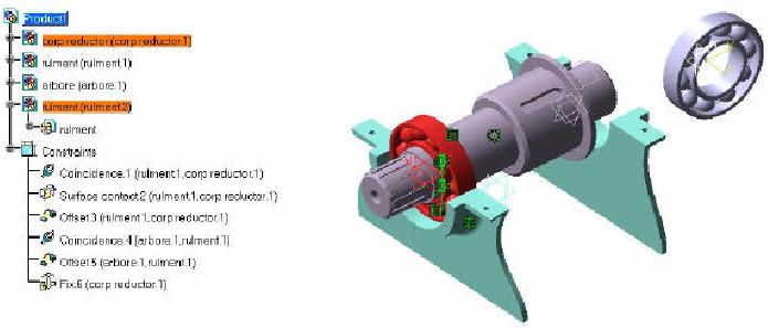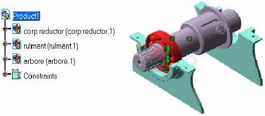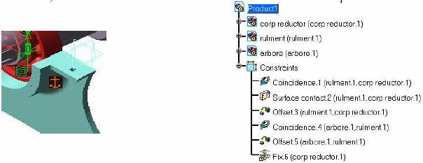 Se alege optiunea Fix, iar componentul selectat este fixat imediat, acest lucru fiind vizibil prin afisarea pe corp a unei ancore (Fig.15). Constringerile aplicate - impreuna cu simbolurile corespunzatoare acestora - sint vizibile in arborele de comenzi (de exemplu suprafata de contact intre rulment si corpul de reductor, Fig.16).