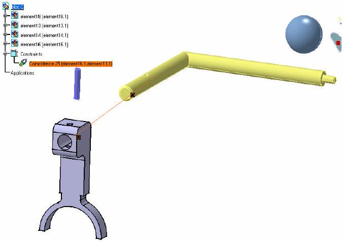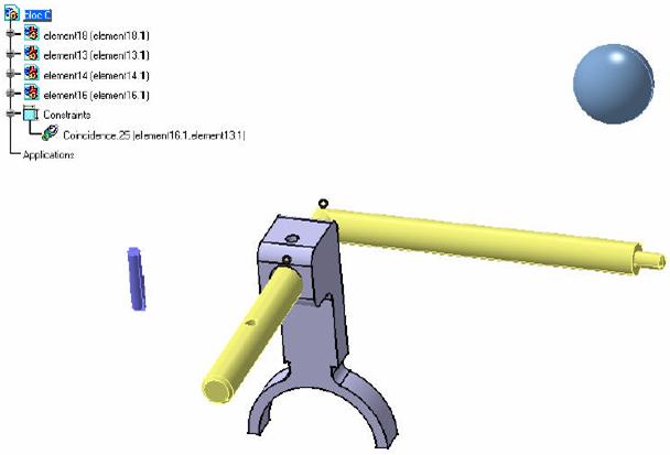 Coincidence intre elementul 16 si elementul 13 prin selectarea axelor (constringerea apare automat in arborele de comenzi din partea stinga a ecranului, Fig.24, rezultatul aplicarii acestei constringeri fiind prezentat in Fig.25).