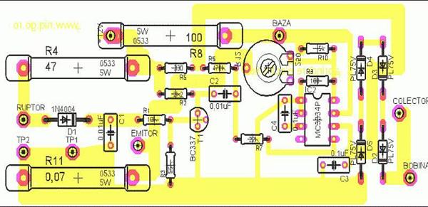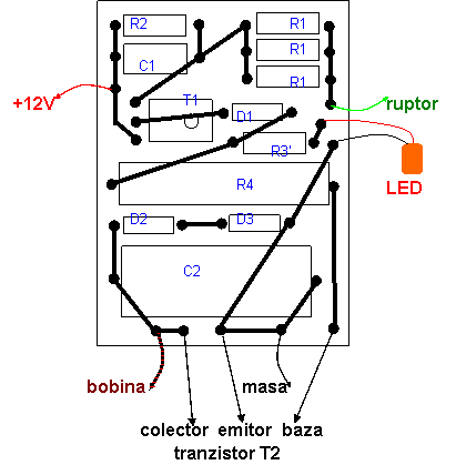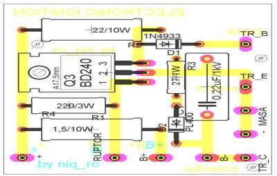 Observatie: condensatorul C2 la valoarea de 0,1uF creaza uneori probleme la pornire si la turatii mari ale motorului, asa ca... am revenit la schema originala... solutiile de rezolvare sunt urmatoarele: 2 condensatoare de 0,1uF/630-1000V in paralel sau montarea condensatorului care fusese montat pe delcou, in paralel cu bobina, pe firul care iese din aprindere