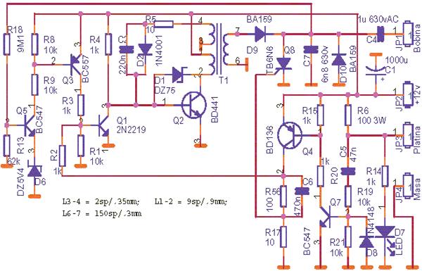 tensiune de aproape 550 V si apoi cind iau firul de platina de la masa apare si
