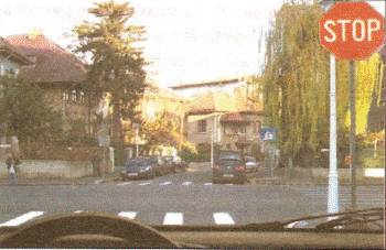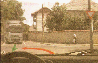 In interseca)ia care urmeaza: a) opresti la 5 m de trecerea de pietoni si acorzi prioritate; b) reduci viteza si virezi la dreapta; c) opresti la marcajul transversal de oprire si te asiguri, dupa care virezi la dreapta. |