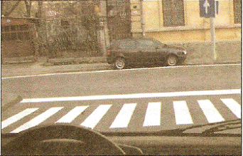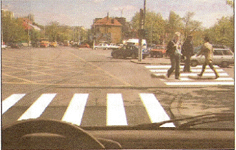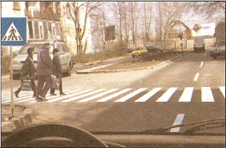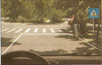 Cum trebuie sa te comporti in aceasta situatie? a) accelerezi, pentru a trece prin fata pietonilor; b) opresti, pentru a permite pietonilor traversarea; c) dai un semnal scurt de avertizare, pentru ca pietonii sa ramana pe trotuar. |