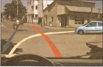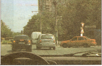 Care dintre cele trei autovehicule va trece ultimul prin intersectia din imagine? a) autoturismul rosu; b) motocicleta; c) autoturismul galben. |