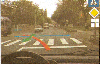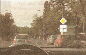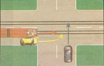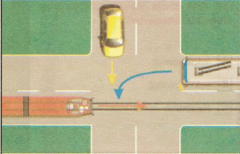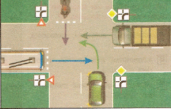Care dintre cele trei vehicule trece primul prin intersectie? a) autoturismul albastru, deoarece vine din dreapta celorlalte doua vehicule; b) tramvaiul, deoarece are prioritate in mers; c)autoturismul galben, deoarece isi schimba directia de mers. |
