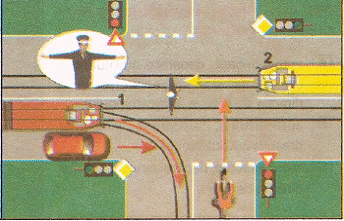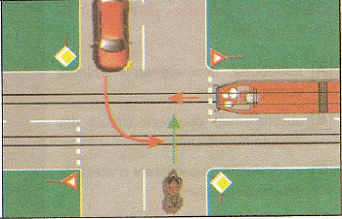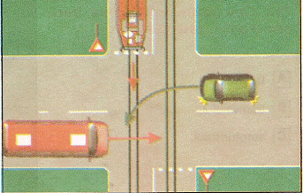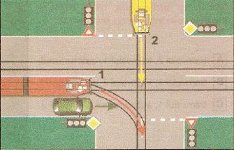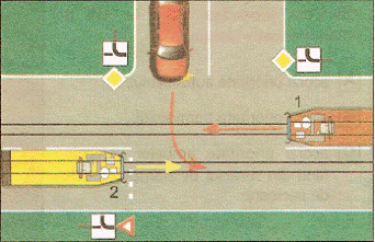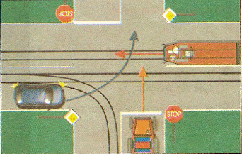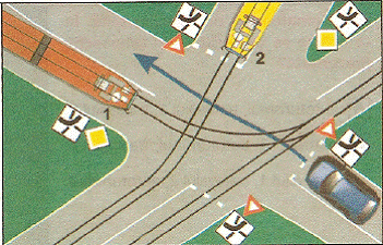 Care dintre vehicule va trece primul prin intersectie? a) tramvaiul 1; b) tramvaiul 2; c) autoturismul. |