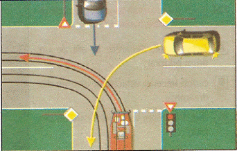 Care comportament este corect, daca te afli la volanul autoturismului galben? a)circuland spre stanga, vei traversa ultimul intersectia; b)vei permite trecerea tramvaiului; c) vei traversa primul intersectia. |