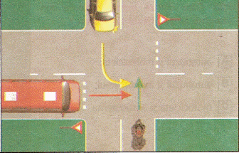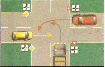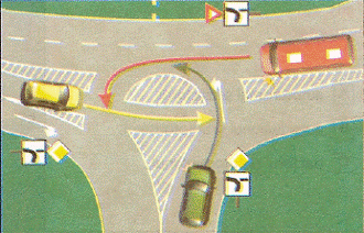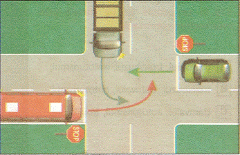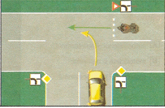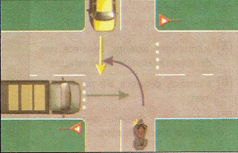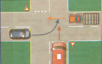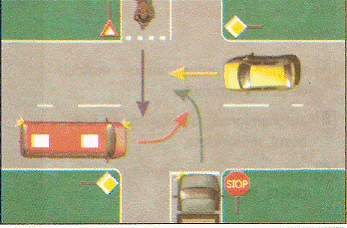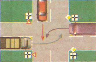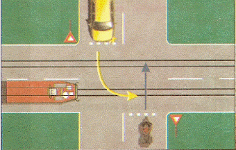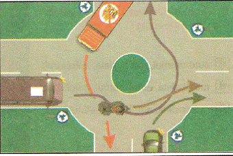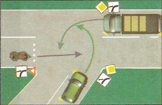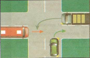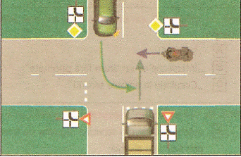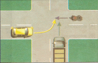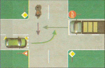In ce ordine vor trece autovehiculele prin intersectie? a) autoturismul, motocicleta, autobuzul; b) motocicleta, autoturismul, autobuzul; c) motocicleta, autobuzul, autoturismul. |