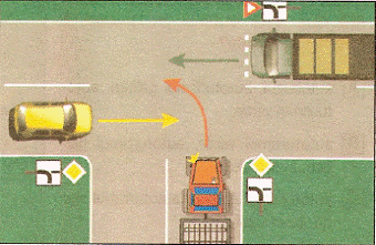 Care este ordinea de trecere prin intersectia prezentata? a) motocicleta, autoturismul, autocamionul; b) autocamionul, autoturismul, motocicleta; c) autoturismul, motocicleta, autocamionul. |