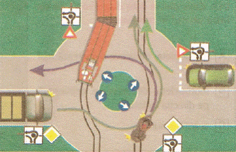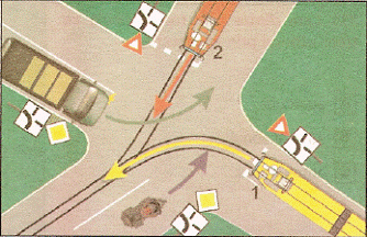 In ce ordine vor trece autovehiculele prin intersectie? a) motocicleta, tramvaiul 1, tramvaiul 2, autocamionul; b) motocicleta, autocamionul, tramvaiul 2, tramvaiul 1; c) tramvaiul 1, tramvaiul 2, motocicleta, autocamionul. |