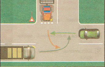Cum se procedeaza in situatia prezentata? a) vei vira ultimul; b) ai prioritate; c) camionul trece primul. |