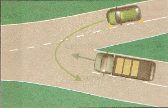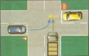 Autoturismul albastru vireaza la stanga. Trebuie sa-i acorzi prioritate? a)depinde de viteza celor doua vehicule; b) da; c)nu. |