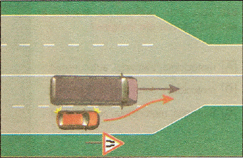 Ce comportament este corect in acest caz? a)trebuie sa permiti trecerea autocamionului; b) trebuie sa permltl numai trecerea autoturismului; c) ai voie |