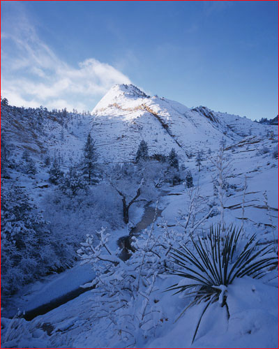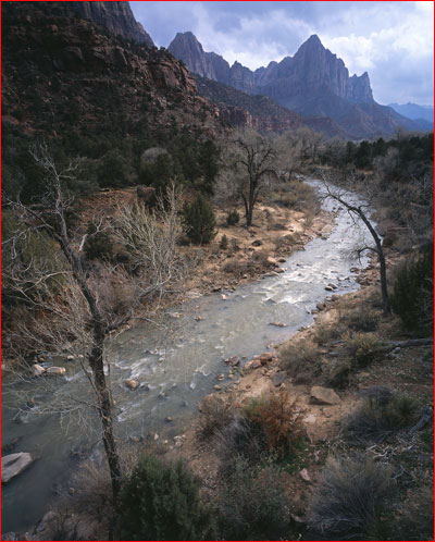 In fotografia de peisaj nu avem drumuri sau cai ferate, decat numai daca decidem sa includem in cadru si constructii ale omului. Din fericire avem si alte elemente, care actioneaza la fel de eficient. Unul dintre acestea este un curs de apa, asa cum se poate observa in fotografia raului Virgin la apus. In acest caz, cursul de apa ne calauzeste privirea in adancime, spre orizont. Forma serpuitoare a albiei raului adagua romantism imaginii si o face mai interesanta.