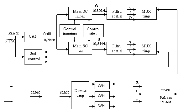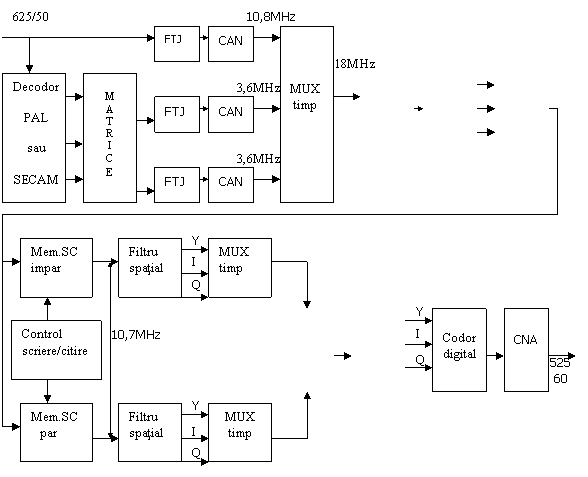 Semnalul de intrare PAL sau SECAM este transmis printr-un FTJ pentru a obtine semnalul de luminanta Y si decodat pentru a obtine componentele RGB din care prin matriciere se obtine semnalele I si Q. Semnalele analogice I si Q sunt convertite in semnale digitale prin intermediul a trei convertoare CAN. Urmeaza multiplexarea in timp a celor 3 semnale de cote de 18Mbit/s, dupa care se realizeaza interpolarea pe linii (reducerea numarului de linii cu 100). Semnalele de la iesirea interpolatorului de linii este demultiplexat in timp pentru a obtine componentele digitale Y, I, Q. In codorul care urmeaza obtinem semnalul codat NTSC de 525 linii si cu fq semicadrului de 50Hz.