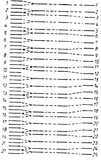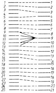 Intrucat 625:525=25:21, un ciclu complet se realizeaza in 25 de linii de intrare. In figura este aratata relatia spatiala intre cele doua structuri de linii. Pentru o conversie de calitate este necesar ca informatia spatiala a unei linii sa se obtina folosind informatia de la 5 linii. Liniile 4, 10, 17, 23 se folosesc in procesul de interpolare. Secventa 25:21 se repete ciclic si in 25 de cicluri complete se obtine imagine unui cadru TV. In practica se foloseste interpolare delta, a carei scheme este data in figura 2.19. Se folosesc 5 unitati de intarziere a cate o linie fiecare, multiplicatori si sumatori. Semnalul la iesire interpolarii este egal cu: