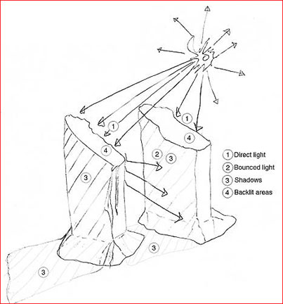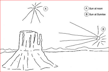 Lumina Soarelui la amiaza si rasarit: acest desen al Monument Valley arata pozitia Soarelui la amiaza si la rasarit. La amiaza Soarele este pozitionat direct deasupra formatiunii stincoase producind umbre mici la baza ei. La rasarit Soarele este la nivelul orizontului producind o iluminare laterala cu umbre lungi pe marginea stincii.