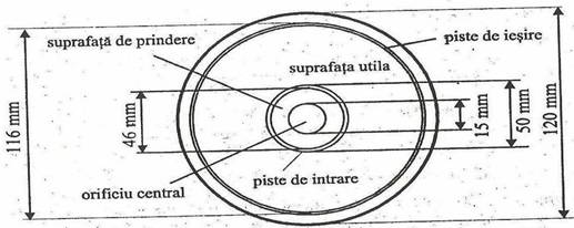Cea mai mare parte din suprafata discului se constituie ca suprafata de prindere pentru dispozitivul de citire si orificiu pentru axul motorului de antrenare.Datele sunt inregistrate pe o suprafata a carei lotiune este de numai 35,5 mm,si care,pe langainformatia utila,mai contine zonele cu pistele de intrare si de iesire ce nu cuprind decat date utilizate pentru control.