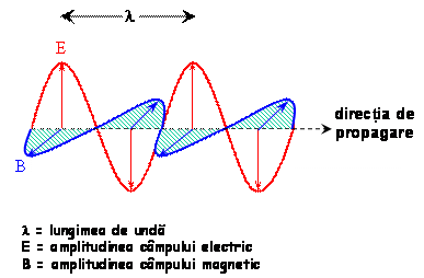Radiatia electromagnetica este o unda care are doua componente: cāmpul electric (E) si cāmpul magnetic (B). Cele doua cāmpuri variaza periodic (oscileaza) īn timp si spatiu, fiecare pe o directie perpendiculara pe directia de propagare a undei si perpendicular unul pe celalalt. Un cāmp electric oscilatoriu genereaza un cāmp magnetic oscilatoriu, si invers. Īn acest fel se creeaza o unda care se propaga de la sine īn spatiu - unda electromagnetica.