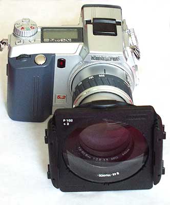 Aparat foto Minolta Dimage 7, adaptor P si filtru Cokin P102 montat