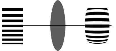 Subiectul devine extrem de delicat in cazul obiectivelor zoom (transfocatoare). Prin scopul lor, acestea isi pot modifica distanta focala, implicit si pozitia centrului optic. Prin modificarea focalei transfocatoarelor, centrul optic se muta anterior pentru focale mai mari sau posterior, pentru focale mai mici. Deoarece diafragma este situata intr-o pozitie fixa, indiferent de distanta focala, in cazul acestui tip de obiectiv, proiectantii au trebuit sa faca un compromis intre distorsiunile "in perna" la pozitia tele si cele "in butoi" la pozitia superangular. Astigmatismul Astigmatismul reprezinta defectul unei lentile de a nu putea focaliza in acelasi plan razele care abordeaza sistemul optic pe diametre perpendiculare. Planul care traverseaza o lentila pe un diametru paralel cu subiectul poarta numele de plan radial, iar cel perpendicular pe planul radial - plan tangential. Imaginea unui subiect situat pe axa optica este rezultatul refractiei numai pe planuri radiale si nu este afectata de astigmatism. Astigmatismul se manifesta in cazul refractiei razelor provenite de la obiecte indepartate de axa optica, si este rezultatul diferentelor intre profilul lentilei in planul radial si profilul in planul tangential. Planul tangential are o putere convergenta mai mare decat cel radial, astfel incat va genera o imagine decalata anterior. Un punct luminos va produce o imagine sub forma unei elipse cu axul mare orientat in planul tangential; in spatele acestei imagini va apare o imagine sub forma unei elipse cu axul mare orientat in planul radial. Intre cele doua imagini eliptice se poate inregistra o pata difuza, mai mult sau mai putin rotunda. Obiectivele de foarte buna calitate produc pe negativ (examinat la microscop) o imagine stelata cu patru colturi. Obiectivele de calitate mai putin decat perfecta vor determina o imagine mai difuza, intrucat aberatia de astigmatism se combina cu cea a curburii de camp, pentru a determina coma.