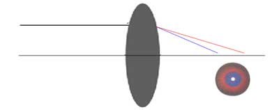 In planul captorului, imaginea va fi reprezentata de un punct alb in centrul unei pete rosii (daca punerea la punct s-a facut in locul unde focalizeaza razele albastre si verzi), sau un punct alb in centrul unei pete albastre (daca punerea la punct s-a facut in locul unde focalizeaza razele rosii). Aceasta diferenta de focalizare in functie de lungimea de unda, mai poarta numele si de "dispersie". Formulele de sticla crown au in general o dispersie redusa, in timp ce sticlele flint au o dispersie mai mare. Dar exista si exceptii: sticle crown cu dispersie mai lunga sau sticle flint cu dispersie mai scurta, de aceea denumite si sticle cu dispersie "anormala". Prin utilizarea unei combinatii de sticle flint si crown se pot realiza obiective care sa focalizeze in acelasi plan radiatia rosie si albastra; radiatie verde si purpurie raman totusi in afara planului de claritate. Aceasta combinatie de lentile defineste un obiectiv "acromat", si care pastreaza deci o proportie reziduala de aberatii cromatice. Introducerea de lentile confectionate din sticla cu dispersie "anormala" corecteaza in buna proportie si aceste reziduuri de aberatie cromatica. Se poate demonstra matematic faptul ca