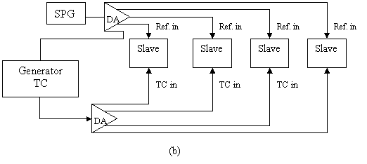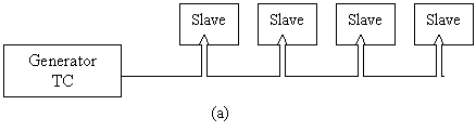 Se poate folosii in practica o varianta simpla cu un generator de semnal de TC si o legare in cascada a echipamentelor pe baza relatie “master - slave” ce poate exista intre ele. Dezavantajul acestei metode este faptul ca trecerea semnalului dintr-un echipament in altul determina aparitia unor intarzieri. De aceea se recomanda folosirea celei de a doua metode, mai complexe, dar si mult mai precisa ce presupune o distribuire in paralel a unui semnal general de sincronizare la toate echipamentele precum si transmiterea tot paralel a semnalului de TC (figura 8.8).