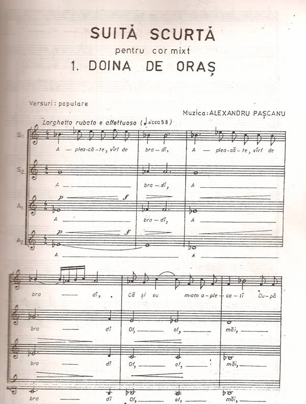 Compozitor cu o serioasa pregatire profesionala si conferential la catreda de armonie si orchestratie a Conservatorului "Ciprian Porumbescu" din Bucuresti, Alexandru Pascanu (1920-1989) a scris mai putine lucrari corale, însa toate bine conturate sub aspectul arhitecturii edificiului sonor si realizate cu multa fantezie coloristica. Stilul sau contine trei elemente distincte, adesea îmbinate convingator: armonia impresionista (cu acorduri de cvarte, none, septime, paralelisme de acorduri hexatonale), armonia cromatica (provenita din discursul muzical wagnerian), elemente melodice, derivate din folclorul românesc. Fostul elev al maestrilor Constantin Brailoiu si Martian Negrea s-a remarcat ca un excelent compozitor inspirat din bogatele resurse ale folcorului autohton, fiind dotat cu o bogata fantezie timbrala. Aceste caracteristici se desprind din creatiile sale: Noapte de vara, De s-ar vinde dragostea, Chindie, D'ale inimii, Bocete strabune, Festum hibernum, Iarna pe ulita, Dupa datini colindam, Doina de oras; Alexandru Pascanu a mai scris coruri destinate vocilor egale, ca: Hai, trenuletule, Anotimpurile, Ah, ce bucurie, Sa cântam rintintineste, Un cântec pe note.din catalog, Cânta si multe alte piese, pline de elan tineresc. În aceste lucrari, influenta folclorului este mai directa si întâlnim sub acest aspect si moduri adesea utilizate si de creatori ca Dumitru Georgescu Kiriac, Dimitrie Cuclin, Paul Constantinescu, Sigismund Toduta si alti reprezentanti ai stilului coral al muzicii noastre.