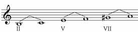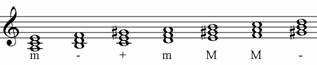 Unitatea 2, gama la minor armonic, prezinta urmatoarea structura intervalica si acordica: