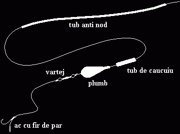__Pentru a realiza aceasta montura aveti nevoie de un tub antinod, un plumb culisant, un tub de cauciuc, un vartej si un ac. Marimile le decideti dumneavoastra in functie de balta si pestele pe care aceasta obisnuieste sa-l ofere. Pe firul principal care pentru crap este de obicei ceva mai gros este introdus un tub anti-nod de circa 15 cm., apoi introduceti un tub de cauciuc de 1-2 cm. in care tubul anti-nod sa intre perfect. Urmatorul pas este sa atasati plumbul si apoi legati capatul de un vartej. Acul va avea atasat un "fir de par" si se va lega printr-un forfac de vartej. pentru a finaliza montura tubul antinod este introdus in tubul de cauciuc.