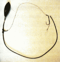 Boilliesul flotant clasic. Se leaga un carlig cu tija lunga, pe firul din prelungirea nodului, inainte de a se face bucla pentru boillies, se introduce pe fir un varnis siliconic care se trage impreuna cu firul pe tija carligului si se face bucla. Cand vreti sa puneti boillie trageti varnisul spre ochetul carligului si astfel rigul ramane liber, puneti boillie-ul si trageti varnisulspre curbura carligului in asa fel incat sa blocati boillie-ul strans langa tija carligului in asa fel incat atunci cand este pus in apa tija carligului sa aiba o inclinatie de circa 45 de grade. |