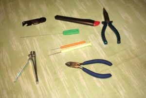un clestisor de unghii (pentru taiat monofilamentul) sau foarfeca; briceag