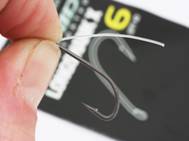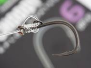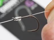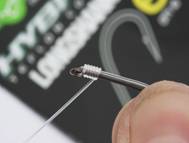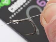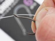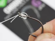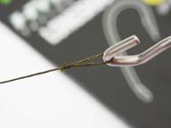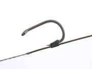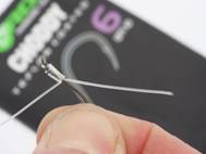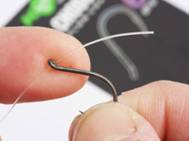 Introduceți firul de fluorocarbon prin ochiul cârligului longshank, precum în imaginea alaturata. |