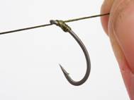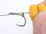 Legați mai multe noduri simple pentru a prinde momeala de anoul cârligului și apot taiați capetele ramase. |