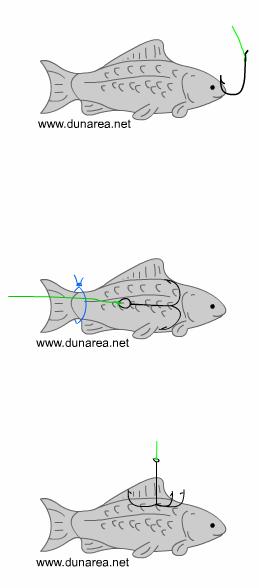 Modul de intepare a pestisorului este prezentat in imaginile urmatoare. Alegerea depinde de tipul pestisorului, de marimea acestuia, stilul de pescuit. Important este ca acul sa fie foarte bine ascutit. Cand il intepati de spate, aveti grija sa nu-i atingeti sira spinarii. Tineti minte ca un rapitor incepe sa inghita prada de la cap. Acesta este motivul pentru care va recomand prima varianta de intepare.