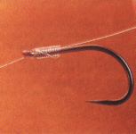 Carefully tie on the hook using the knotless knot (see how to tie the knotless knot). Notice where the whippings stop - just under half way down the hooks shank. After you have tied the knot, bend the tail back and thread a sliding rig onto it as shown in the picture. This is where you will tie your boilie. |