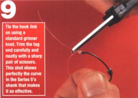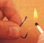 STEP 7 - This is the tricky bit - you need to carefully burn the tag end. A blob of line will appear, that will prevent the 'D' coming apart. STEP 8 - The finished rig should look like this. You can alter the angle of the hook simply by pinching the hook link - it's that stiff! |