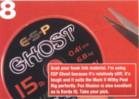 The hooklink I am using here in the photographic sequences is Black Amnesia. I don't actually use it for fishing these days as it has been overtaken by companies like Fox, ESP and Korda who produce specialist stiff links designed solely for carp fishing (Amnesia was designed as a shooting head fly line). One of these , the ESP version has particularly caught my eye. Korda's IQ also fits the bill for this type of rig, as does Fox Casper in the heavier breaking strains.
