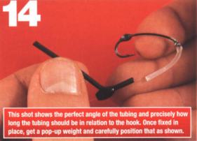 The bend in the shrink tube is the thing that strikes you when you look at the rig for the first time. You think to yourself, 'that can't possibly work,' but I assure you it does! In fact, I've seen this rig in action on quite a few occasions and can vouch for its effectiveness. It's especially good with pop-ups, although Kevin Maddocks uses it with bottom baits (I'm thinking specifically here of the Carp Nuggets he's caught so well on in the last 18 months or so).