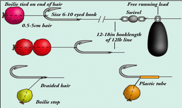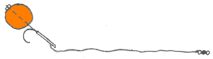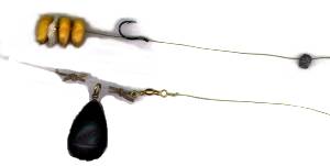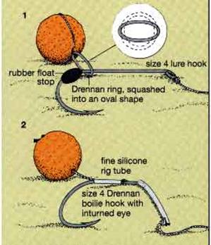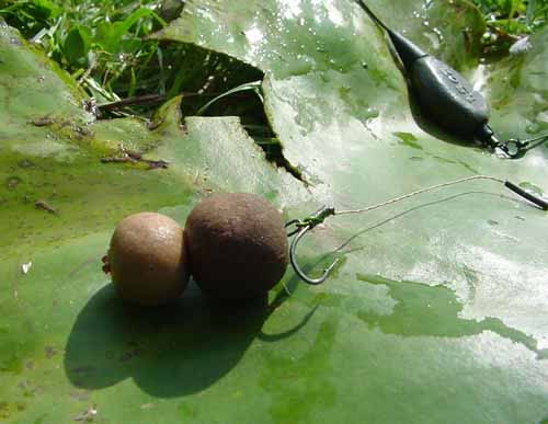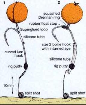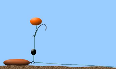 This rig is a variation of the ciritically balanced rig. You get two boilies, one which floats in water and one which sinks. By putting the sinking bait onto the hair below a floating bait, you should find that the pop-up sits at the top with the sinker holding it down. It is possible to achieve a situation whereby the net boyancy of both baits and the hook leaves the setup 'critically balanced' (see above). This can be achieved by changing the size ratio of the boilies, pushing short lengths of lead wire into the bottom bait to decrease boyancy (I think you can buy wire intended for this in tackle shops), or adding foam above the pop-up to increase boyancy. I like to use boilies of the same sort for this but I suppose there's no reason why different flavoured boilies couldn't be used in combination.