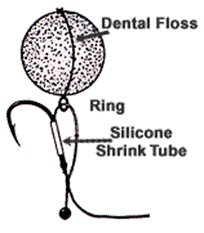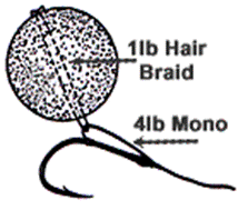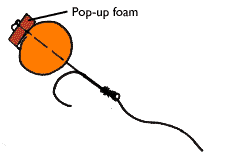 To lock the bait on, insert a stopper in the loop, and slide the bait back against the stopper. Almost anything can be used as the stopper - I use a tiny piece of pine needle. The height of the popped bait can be adjusted by adding a split shot to the leader, or by the length of the leader itself.