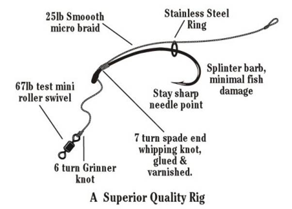 You can tie your own hair rigs quite easily with a length of 25 - 30 lb. test superbraid (which has the same diameter as 6 - 8 lb. test monofilament), some swivels and super-sharp size 8 to 4 hooks, like the "octopus" style from premium hook-makers like Gamakatsu, VMC, Mustad or Owner, to name a few. Superbraid is used because it is soft to the touch, and doesn't coil like mono. Instead of buying a whole spool (it's expensive stuff), you can just purchase a length (20 feet or so) of it from a tackle shop that spools reels