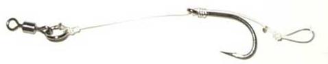 Thread the braided hair through the sliding ring as demonstrated, and secure the boilie in place. You can use some rig glue if necessary. Now for the rest of the hook link. Tie a loop in one end of the link, complete with a sliding ring. Tie a swivel onto the other end of the link which should be about 8 inches long. |