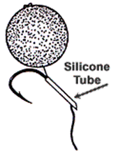 the drig has a loop at the shank of the hook which has a rig ring on it. The boilie is normally tied on to the rig ring using bait floss or ordinary dental floss, although you can tie a hair to the rig ring and mount the bait on that. D-rigs really need to be made from monofilament so that the ring sticks out instead of collapsing inwards and ruining the effect of the rig. Of course, you could always use Kryston's Snake Bite and strip off all the coating from after the hook to the swivel, this would let you make the rig out of braid without ruining the effect of the rig. To make the ring I tie a knotles knot but instead of tying a loop to make a hair, I leave a long tag end. I tie the knotless-knot as normal and when I've finished I pass the tag end through the eye of the hook (after sliding on a rig ring). Then I get a match and carefully burn the end sticking out through the eye so that it forms a 'bobble' on the end which cannot pass back through the eye. I continue to burn it down until I get a loop of just the right size. One product which helps in the construction of this rig is Solar's D-Riggers. The D-Rig is a pop-up rig and only really works with boyant baits, so you will need something to counter-balance the pop-up (not illustrated).