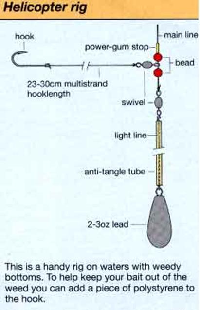 The Helicopter rig was originally used for sea fishing and later adapted for carp fishing because of its anti-tangle properties.The rig was named the helicopter rig after its helicopter blade like motion in flight.The baited hook-link rotates about the main-line axis by the use of the loose fitting hook-link swivel, usually on anti-tangle tubing or lead-core. The Helicopter rig is probably the most commonly used rig when trying to achieve extreme distances because of its anti-tangle properties and it's aerodynamic set-up. The Helicopter rig is best used with a two or three bait 'Stringer', a 'Stringer' is usually free offerings of your hook-bait that are threaded onto dissolvable P.V.A. string and tied to your hook