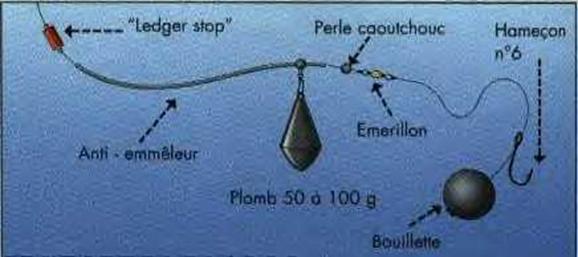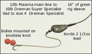 A heavy weight is necessary to set the hook, when a carp "bolts" away from the tension. I've heard some anglers use a lighter weight (1 - 1.5 ounces) and firm up the hook set themselves after a strike. This is the fundamental setup, with a multitude of variations used, like different sinker options, hooks, etc. I'm a "do it yourselfer," and this is the way I figured the rig must be tied, and it's worked for me.