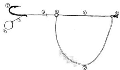To set up the bolt rig, bolt or fix a heavy weight (about a 3 ounce bell sinker) onto the main line. This can be done by tightly knotting a rubber band ahead of the weight. I also knot a rubber band behind the weight next to the swivel to keep the sinker from banging on the knot or slipping onto the swivel. Then trim the ends of the rubber band.