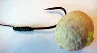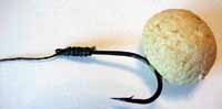 Aceasta montura este preferata mea, mi s-a parut mie ca merge mai bine si da putine rateuri. Se gaureste boilisul cu un burghiu (de 3 mm), se trece cu croseta un elastic prin acesta. Se trece carligul prin ochiul format de elastic si se strange. Capetele elasticului se leaga intre ele, nodul format fiind suficient de mare pentru a folosi ca stoper. Boilisul se pozitioneaza in asa fel ca daca punem montura in apa tija carligului sa aiba o inclinatie de 45 grade.
